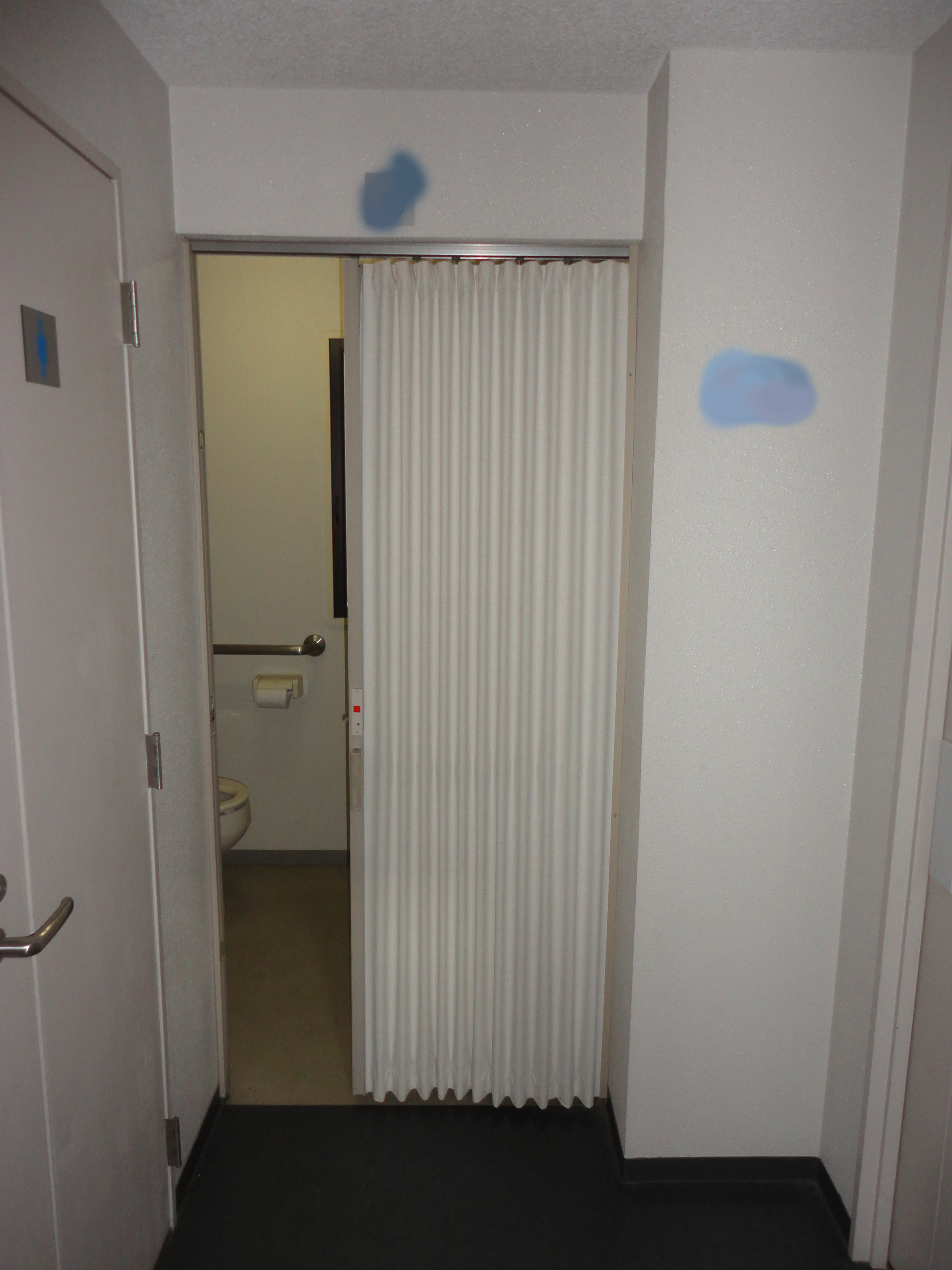 アコーディオンカーテンでも何とか事は足りていたようですが、鍵の方がいよいよ掛かりにくくなってきたようでご依頼を頂きました。色々な方がお使いになられる所ですので、特に女性の方からのご要望もあり、しっかりとしたドアに取替をお勧めいたしました。片開きですと車いすをお使いの方は不便になりますのでアウトセットの引き戸でご提案し施工させて頂きました。大変お喜び頂けました。片開き戸とは? アウトセットとは?