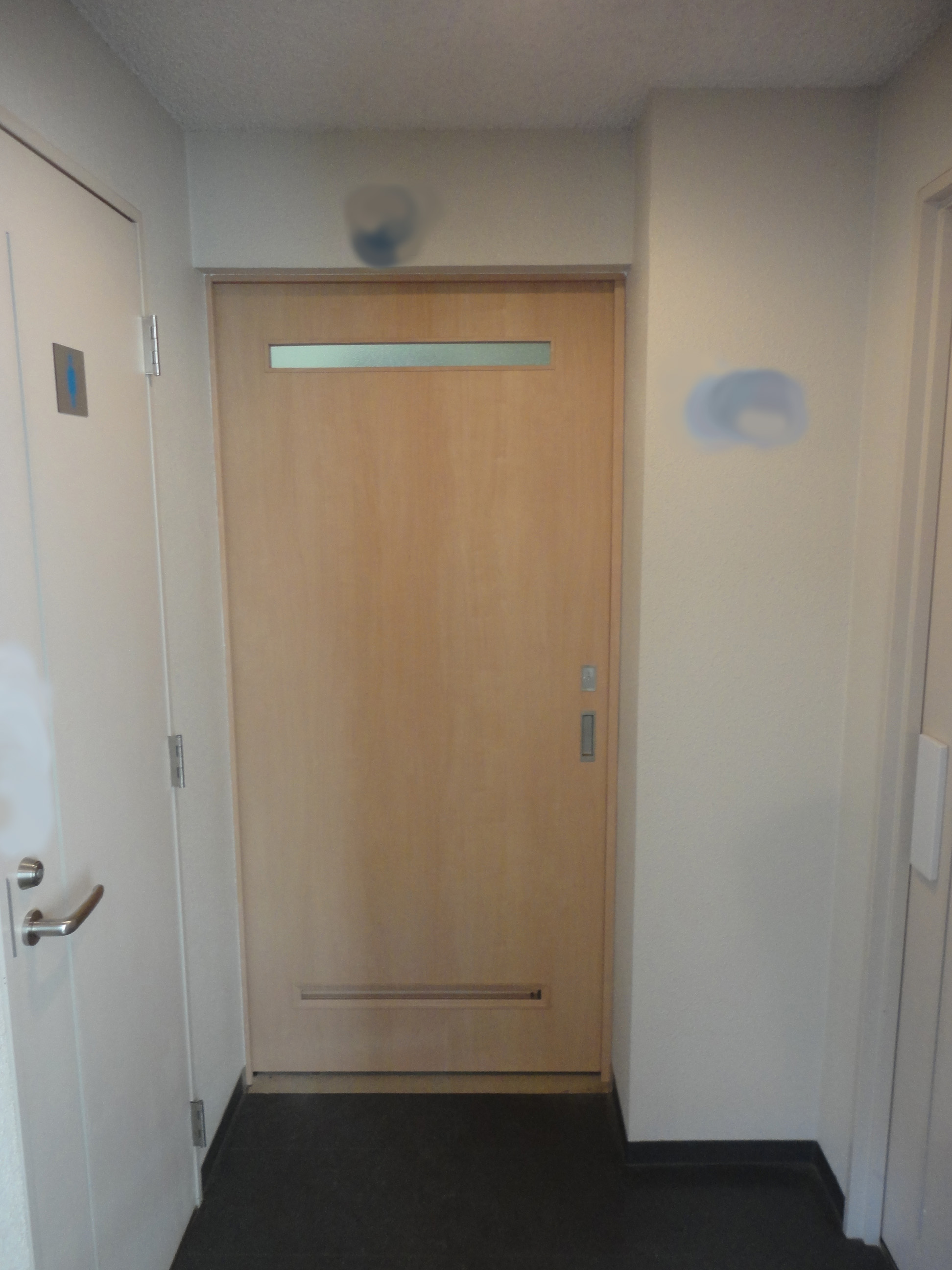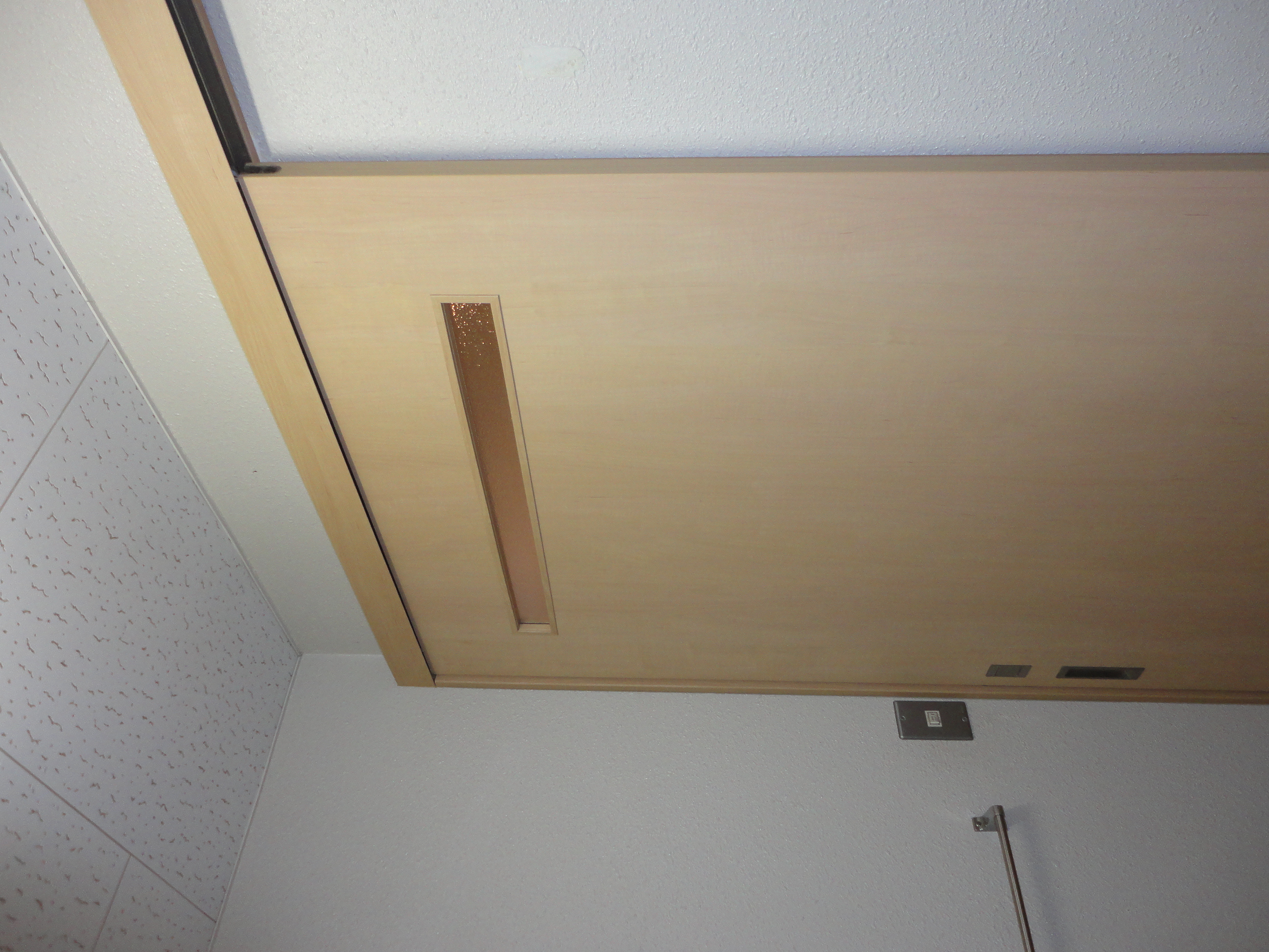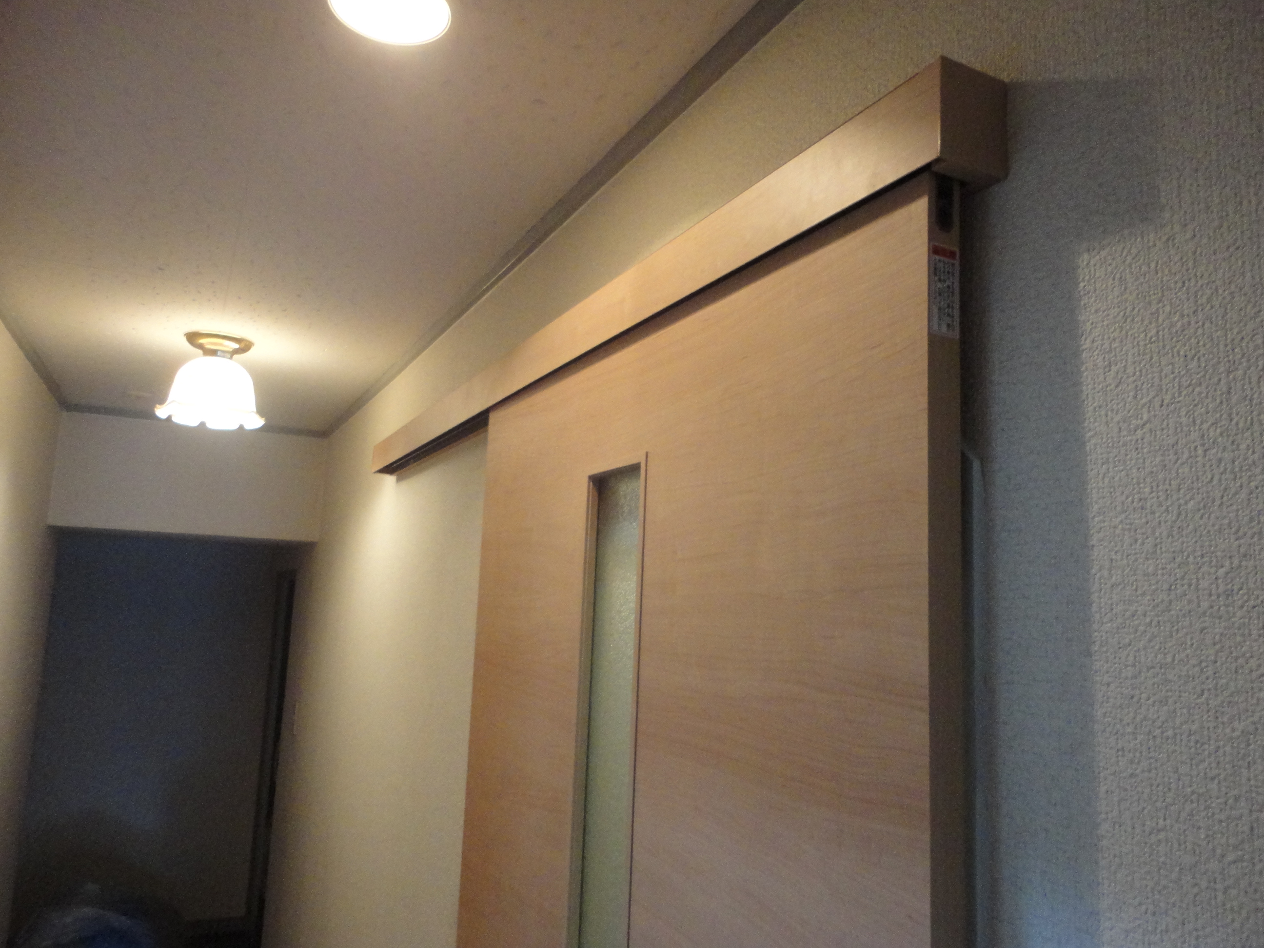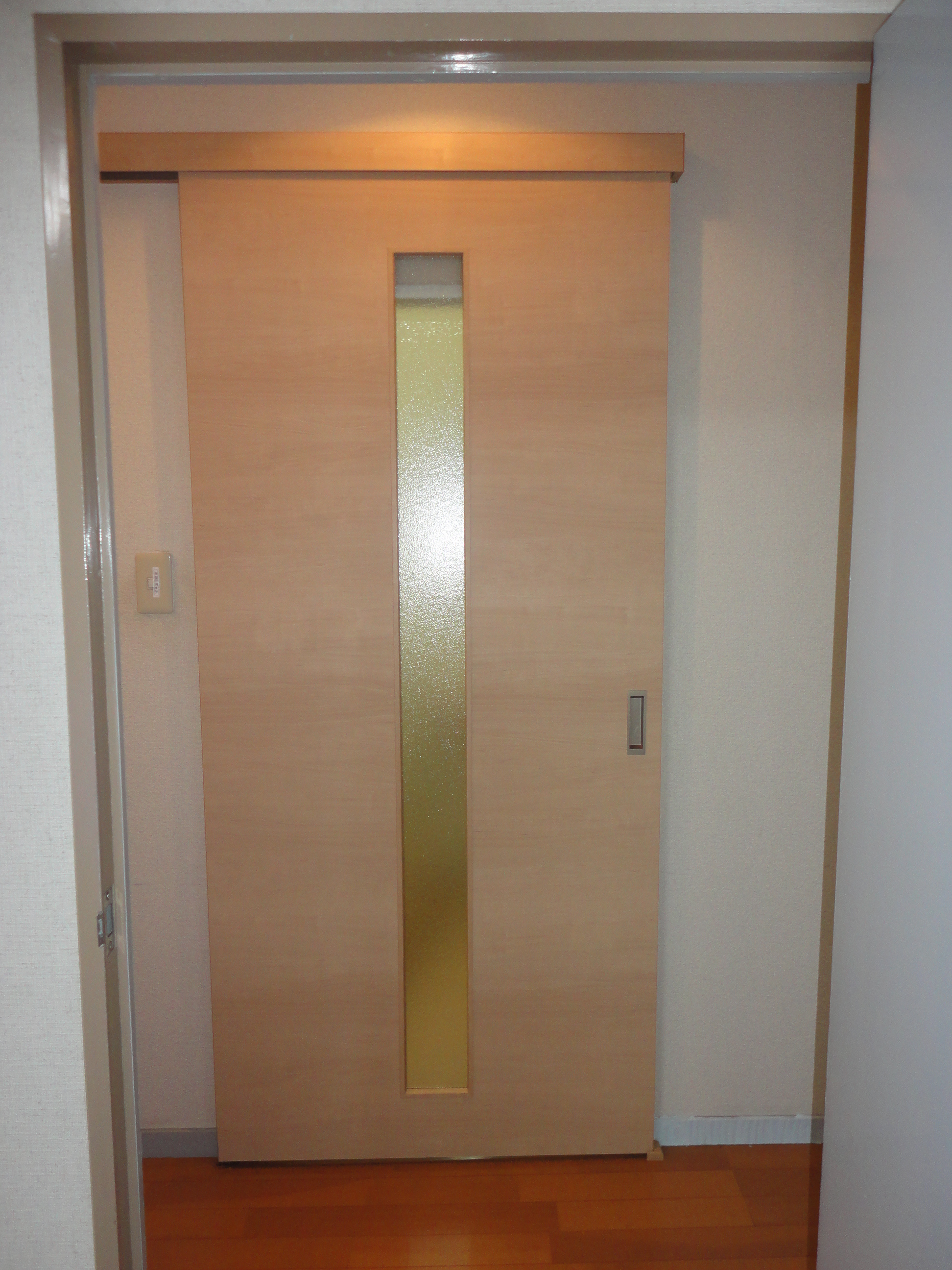 アコーディオンカーテンでも何とか事は足りていたようですが、鍵の方がいよいよ掛かりにくくなってきたようでご依頼を頂きました。色々な方がお使いになられる所ですので、特に女性の方からのご要望もあり、しっかりとしたドアに取替をお勧めいたしました。片開きですと車いすをお使いの方は不便になりますのでアウトセットの引き戸でご提案し施工させて頂きました。大変お喜び頂けました。片開き戸とは? アウトセットとは?